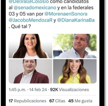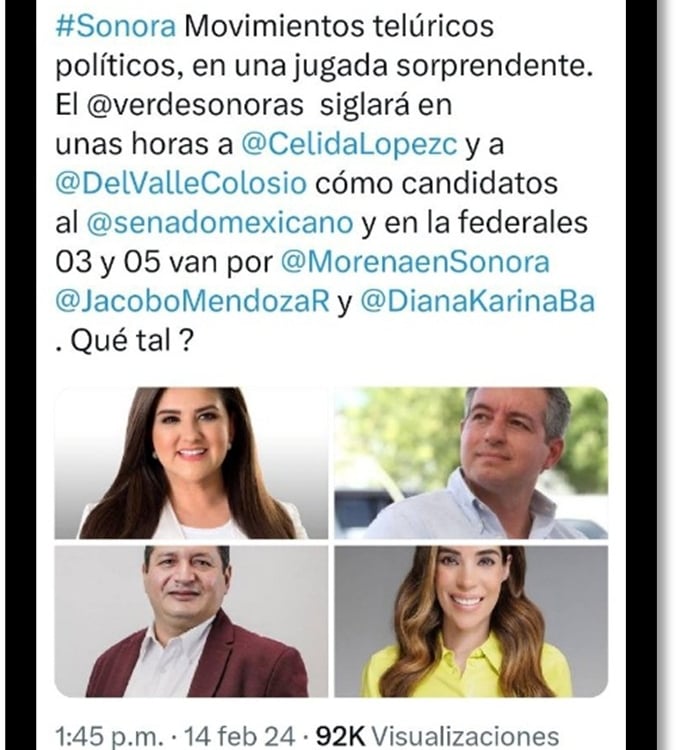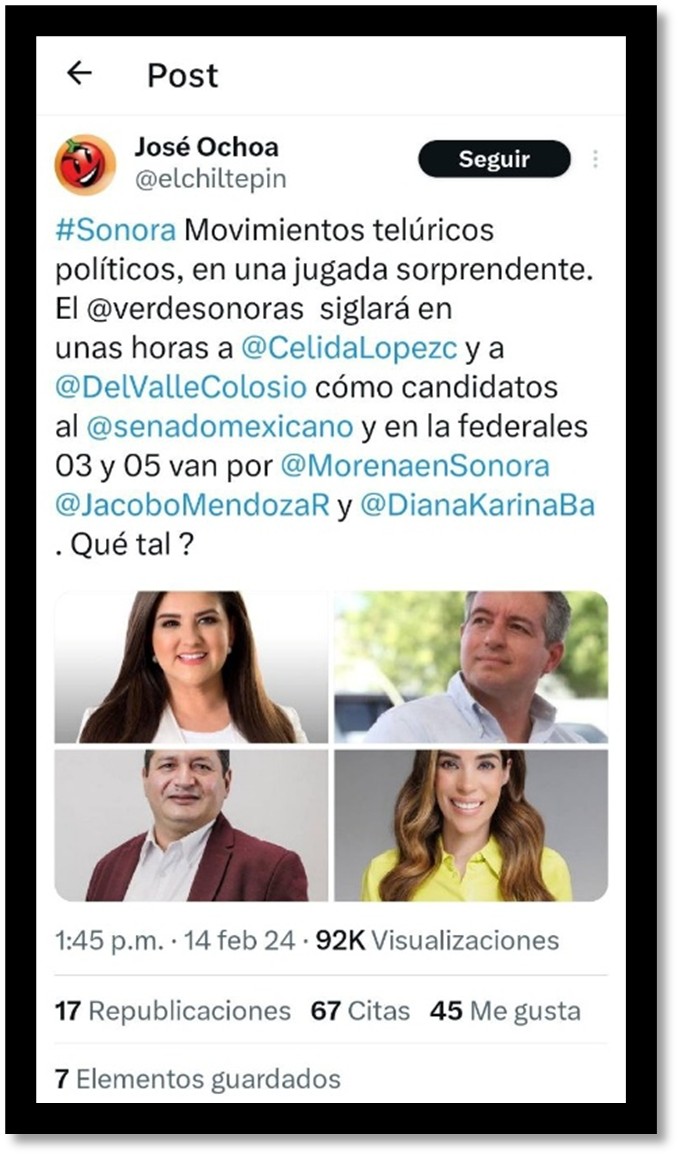 La legítima opinión de Karla Estrella, por la que fue censurada decía lo siguiente: “Así estaría el berrinche de [Sergio Gutiérrez Luna] para que incluyeran a su esposa, que tuvieron que desmadrar las fórmulas para darle una candidatura. Cero pruebas y cero dudas”; haciendo referencia a la noticia sobre la definición de candidaturas del oficialismo en Sonora.